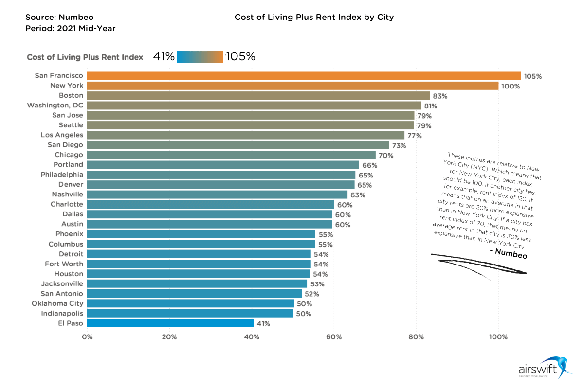 To check that, we went to the data crowdsourcing website, Numbeo, to extract the data referring to the Cost of Living Plus Rent Index. The data gathered the costs for a wide range of cities, taking New York City as its basis for the index (100%) and then determining which cities have higher or lower indexes.