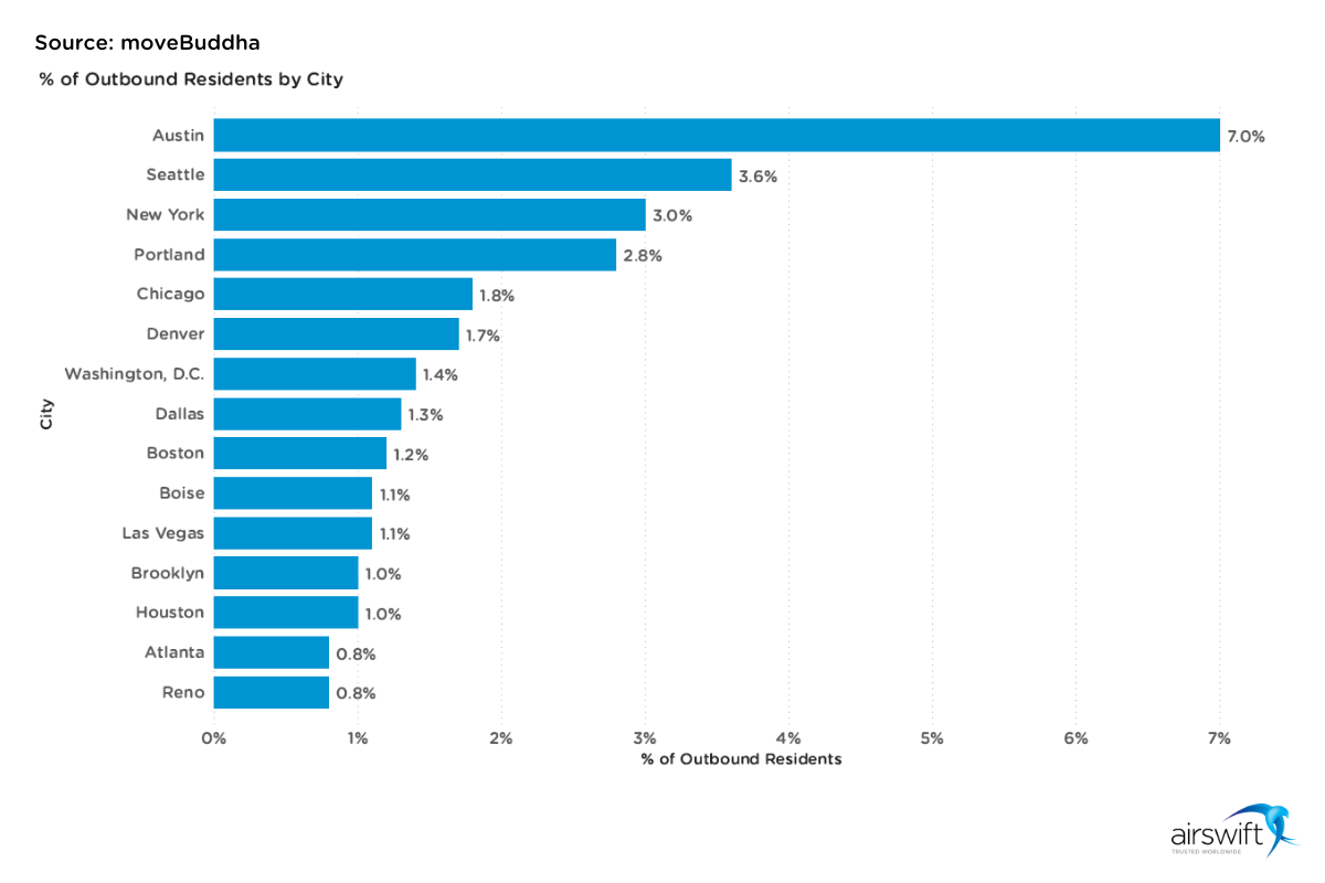 Another source, like the US Postal Service, can point in a different direction and show a more significant increase in resident relocations to suburbs rather than out-of-state destinations. That was published by the San Francisco Chronicle, based on the data extracted from the US Postal Service change-of-address. But even so, in that top 20 destinations, we find Austin and Denver in the records, with the two being the only out-of-state destinations.
