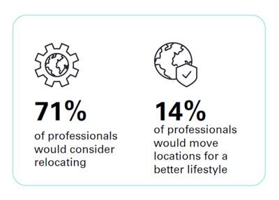 71% of professionals are open to relocating (down from 86% in 2022). Europe (35%) remains the top destination, while North America’s share has slipped to 15%, now level with the Middle East (15%).