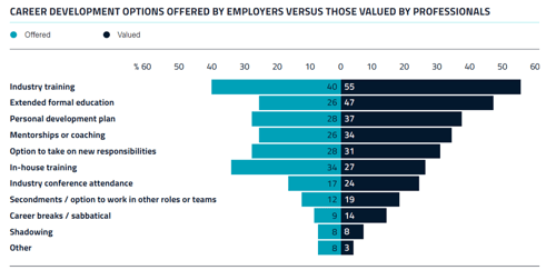 If the sector wants to retain top talent, it may need to act on career development planning and learning and development. Only 46% of professionals say they have a career development plan, and professionals value industry training (57%) and extended formal education (41%) more than employers typically offer.