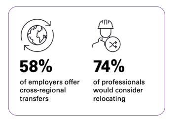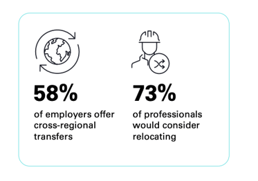 When it comes to transitional energy, there has also been a rise in employers offering cross-regional transfers, with 58% of companies providing these opportunities in 2025 - up from 48% in 2022. However, despite this rise, fewer professionals are willing to relocate. Only 74% of transitional energy professionals would consider moving abroad for work, down 13% since 2021.