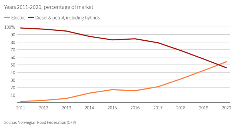 Norway is the largest electric vehicle market in Europe and became the first country in the world where the sale of electric cars has overtaken those powered by petrol, diesel and hybrid engines last year, accounting for a record of 54.3% market share