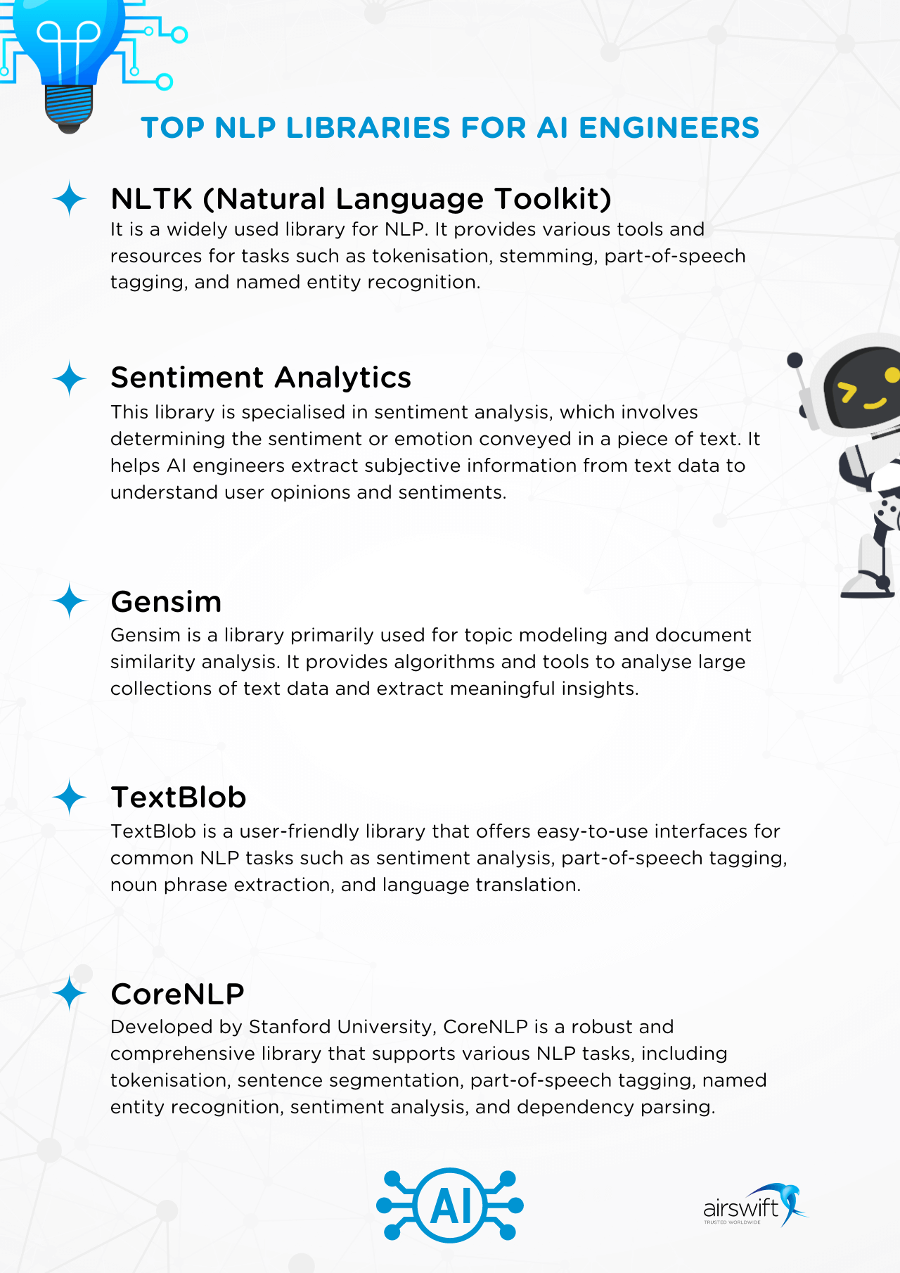 These NLP libraries and tools provide AI engineers with the necessary means to process and understand human language, allowing them to build sophisticated NLP models and applications.