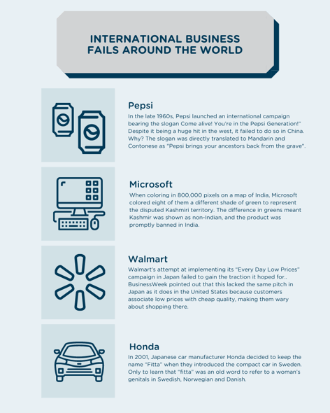 Text explains how Pepsi’s slogan was mistranslated in China to mean “Pepsi brings your ancestors back from the grave.” There’s a faded image of a Pepsi cup filled with soda.