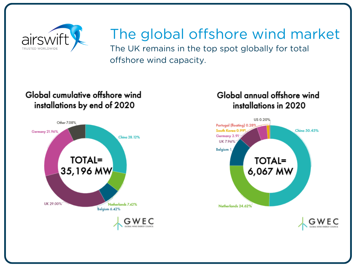 The UK remains in the top spot globally for total offshore wind capacity, while China has now overtaken Germany to become the world’s second-largest offshore wind market.