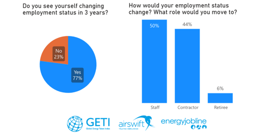 These findings indicate that the oil and gas industry primarily desires individuals with oil and gas skills. However, there is a rising interest in renewable energy among this workforce, which is mobile, ambitious, and environmentally conscious. Employers must consider providing opportunities for their employees to lead more sustainable innovations if they want to retain their talent.