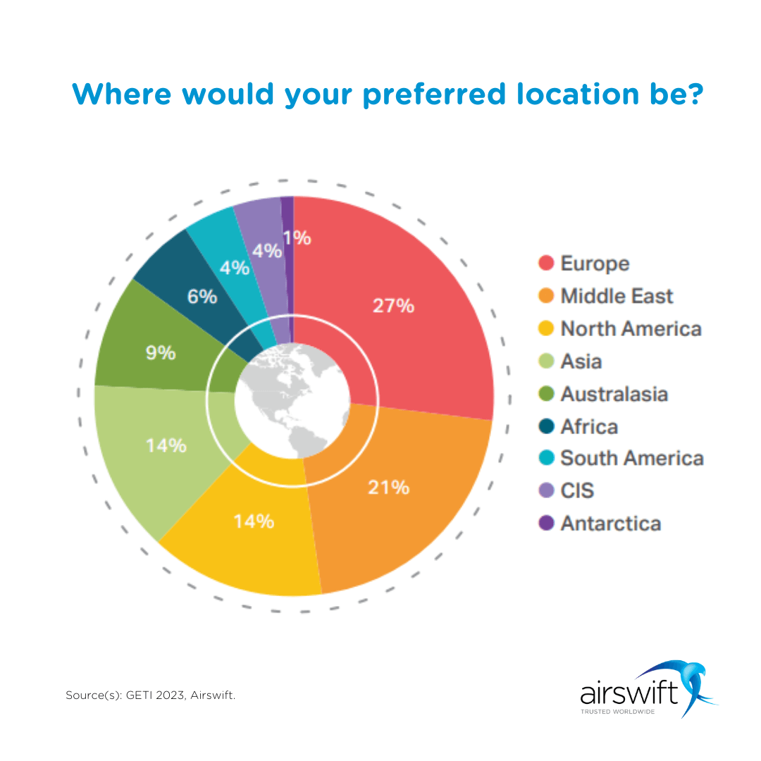 Europe is the most desirable destination for relocation, although the number of those willing to relocate there has fallen from 29 to 26% since last year. This is followed by the Middle East (23%) and Asia (15%). North America dropped out of the top three this year, with 13% stating it as their chosen destination for relocation.