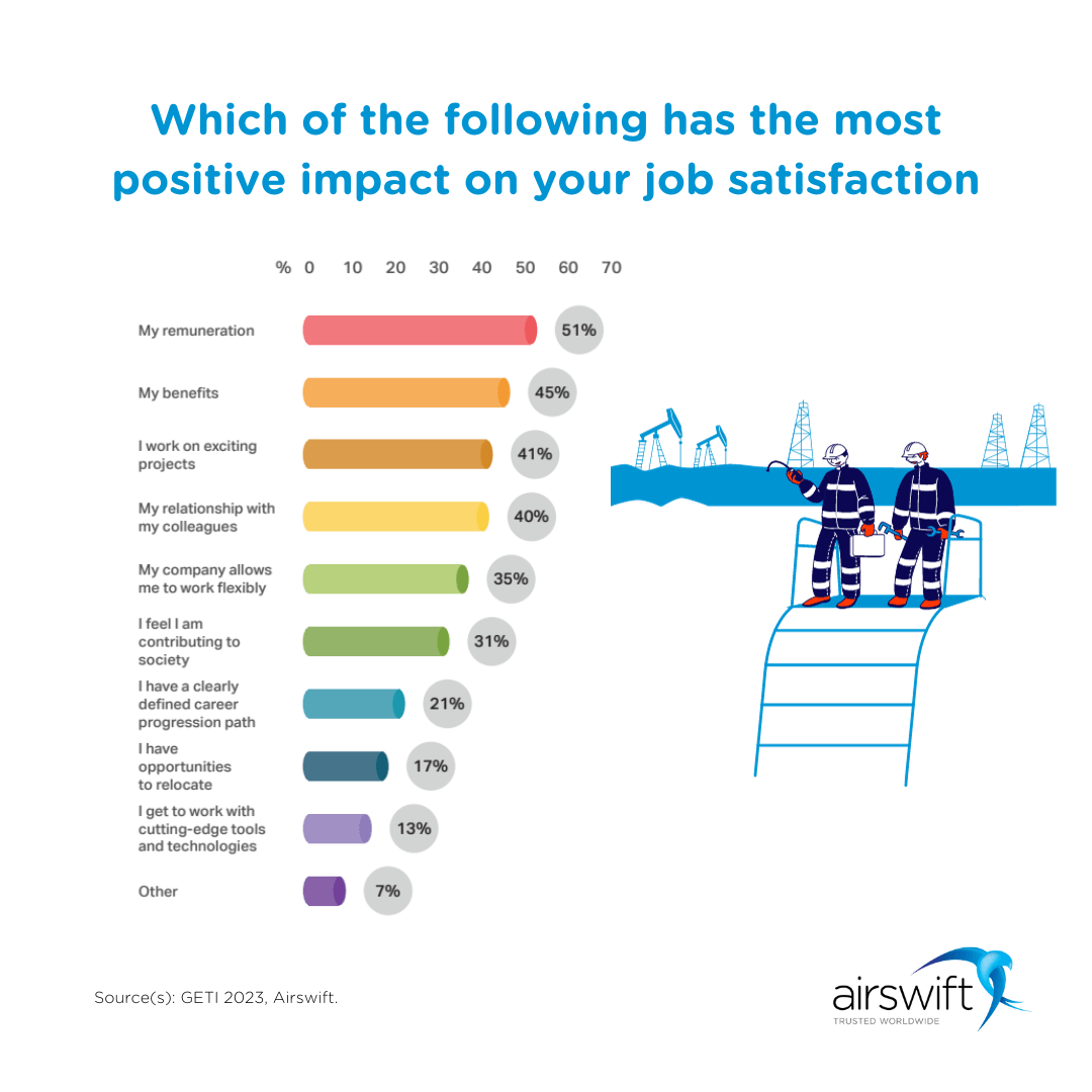 Regarding talent retention, employers should be aware that oil and gas skills are in demand, not just within the sector but across the wider industry. 81% of workers reported being headhunted for another job, and 12% have been approached more than 16 times since last year. 9% of engineers reported being approached more than 21 times by employers looking to hire them.