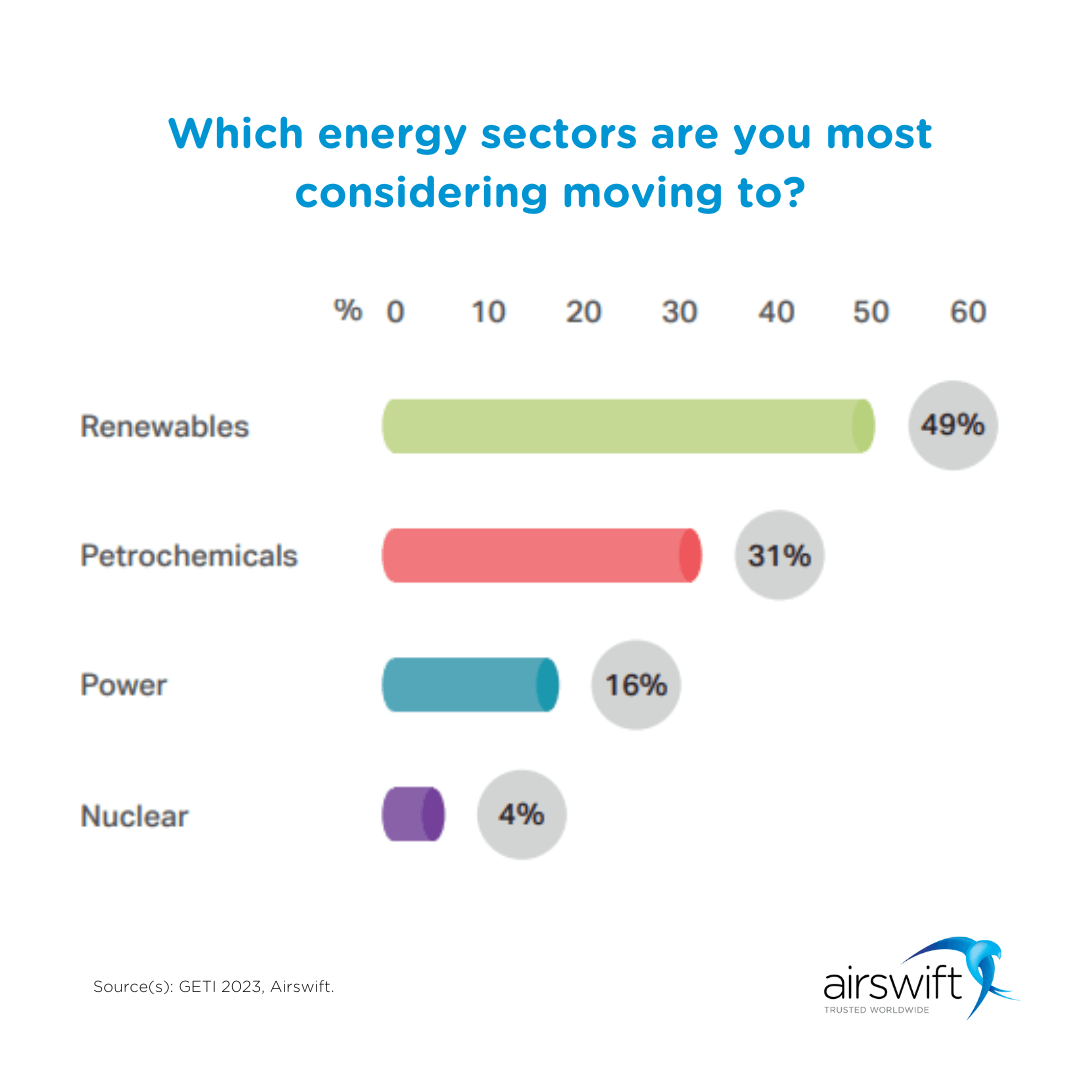Of the 40% that said they would change industries completely, 50% would move to the renewables sector. This is unsurprising considering that ESG (environmental, social and governance) were the third biggest driver for those considering moving careers.