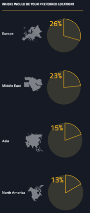 Europe is the most desirable destination for relocation, although the number of those willing to relocate there has fallen from 29 to 26% since last year. This is followed by the Middle East (23%) and Asia (15%). North America dropped out of the top three this year, with 13% stating it as their chosen destination for relocation.