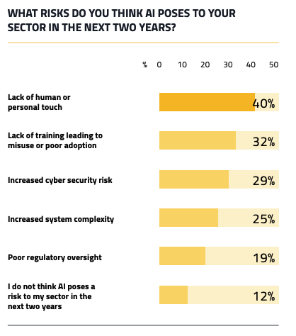 The workforce has several concerns about the potential risks posed by AI. 40% worry about insufficient human contact, 32% fear insufficient training causing misuse, and 28% are concerned about cybersecurity risks.