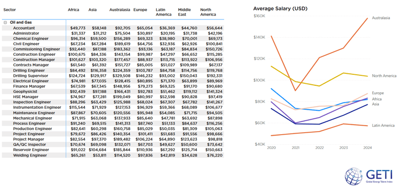 The following tables from the GETI 2025 report highlight regional variations in day rates and annual salaries for oil and gas professionals, offering insights into global compensation trends across key roles in the industry: