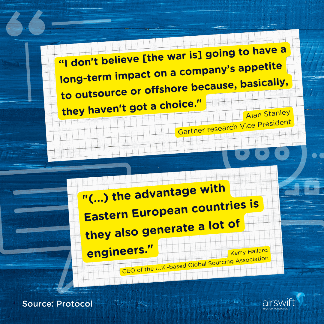 The war may have created huge geopolitical risks, but the market shows no signs of slowing down outsourcing in these countries, as the shortage of tech talent remains a significant challenge.