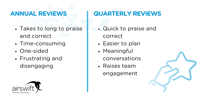 Instead of waiting a whole year to praise an employee for a job well done, quarterly reviews allow positive feedback to be provided promptly.