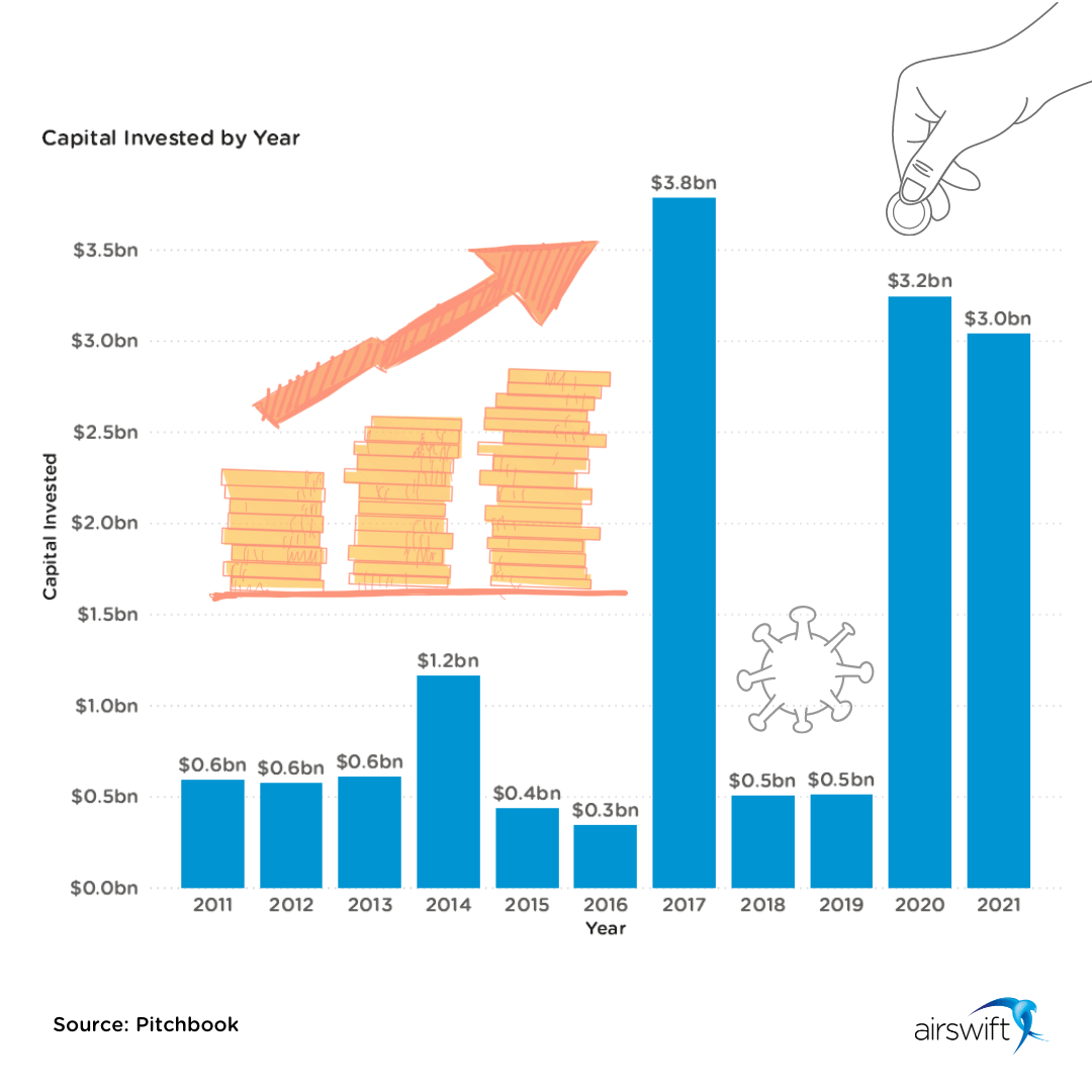 The recent decade has seen a considerable increase in capital invested, with 2021 totaling around 3 billion funded.