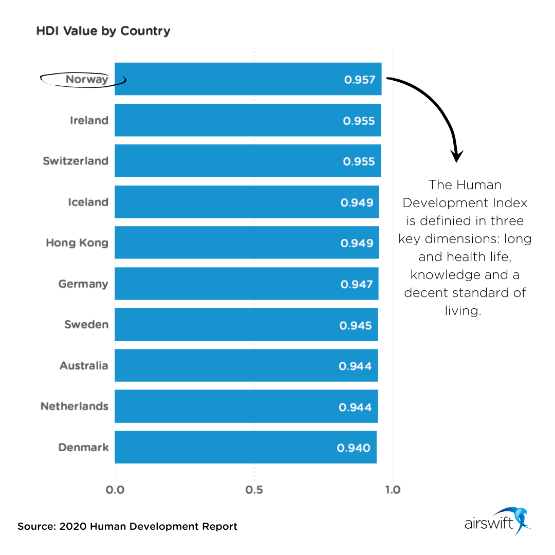 It is impressive to see how the most celebrated countries regarding the quality of life (Switzerland, Germany and Australia) lag behind Norway, which only reinforces its current ability to attract those seeking better opportunities.