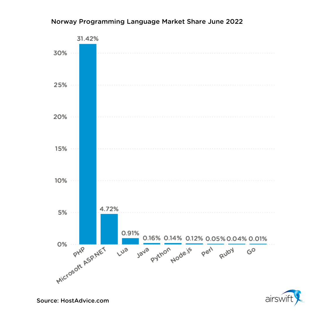 A good way to anticipate this is to look at Norway's current market share. The graphic below contains data provided by HostAdvice featuring the languages with the most clients in Norway.