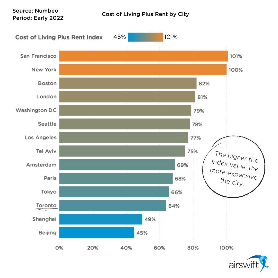According to the data crowdsourcing website, Numbeo, Toronto places only behind Beijing and Shanghai, making it the Western city with the best cost-of-living among today's top tech clusters. This is another good reason why the Toronto tech boom will not end soon.