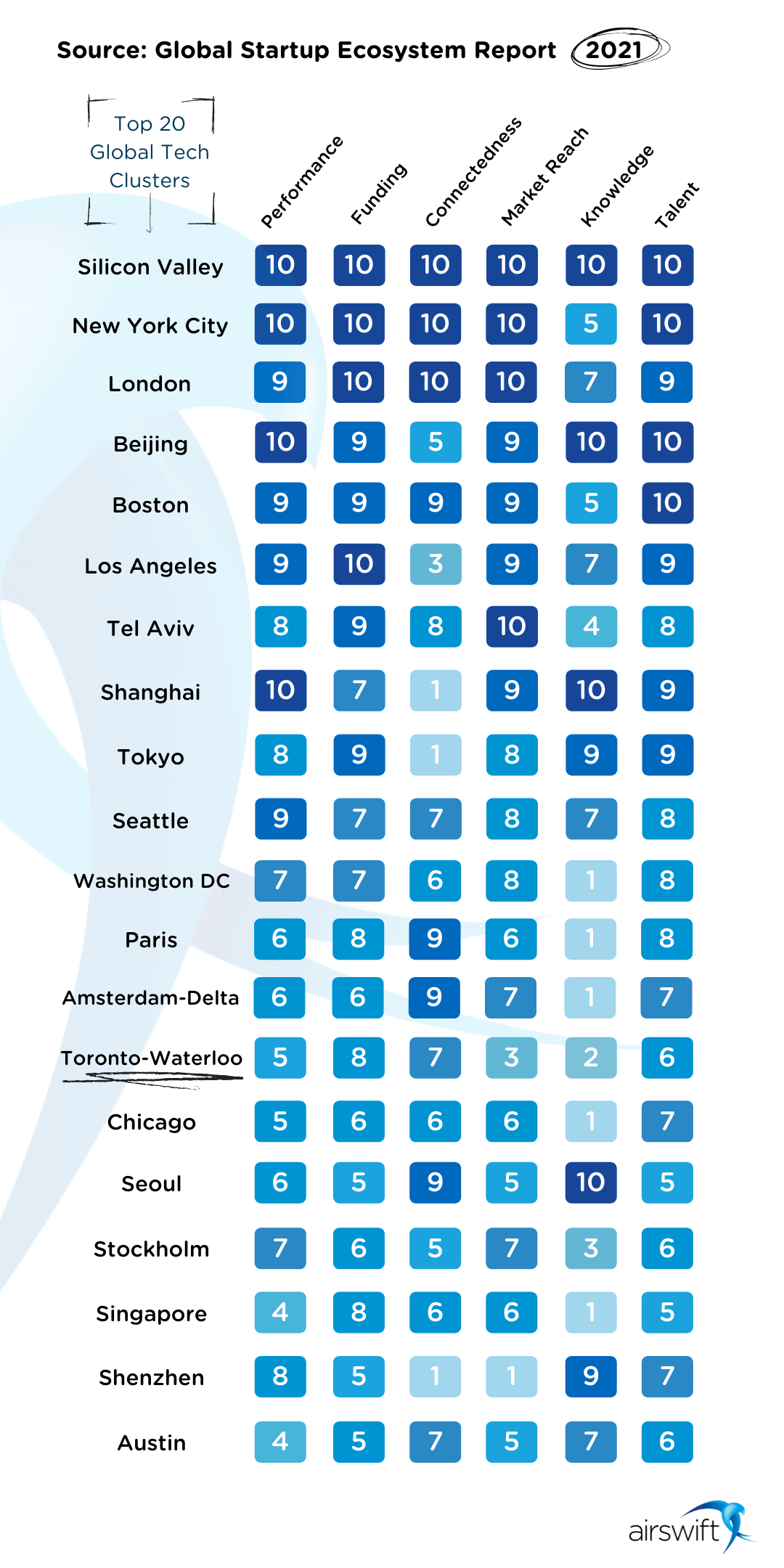 With all those factors put on the table, the Toronto-Waterloo Corridor ranked globally at the 14th position out of the top 20 tech clusters.