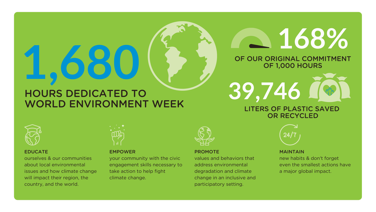 We're proud to announce that our global teams dedicated 1,680 hours to World Environment Week - 168% of our original target! Throughout the course of the week, 39,746 litres of plastic was saved or recycled.
