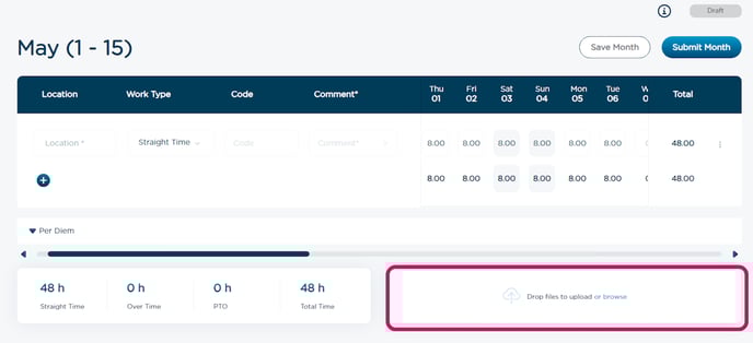 12. (Optional) To attach supporting documents to a timesheet, either drag and drop the file or click on "browse".