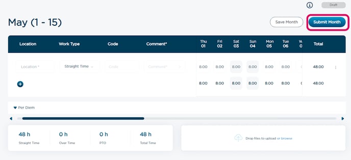 13. When the timesheet is complete and you are ready to submit it to your line manager, click on "Submit Month".