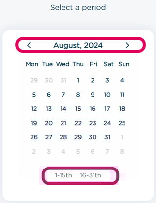 4. Select the year and month for your timesheet. Next, select the period for the timesheet. Once selected, click "Next".