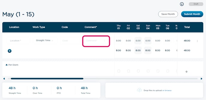 8. (Optional) If necessary, add a comment or description for the time entered by clicking on the comments field.