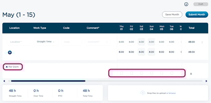 Tip: Use the scroll bar to navigate to the days in which you would like to claim per diem.