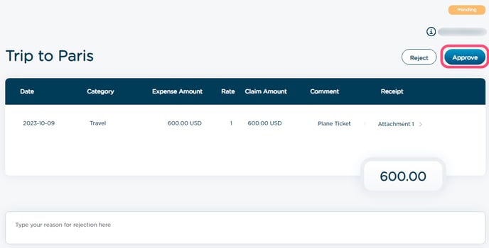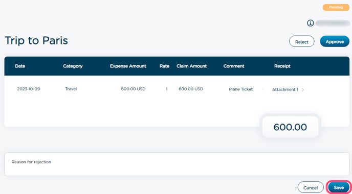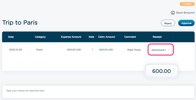 3. Click on a pending expense row to open it for a detailed review
