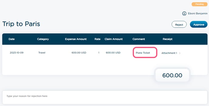 Tip: Rejection comments will be saved to the expense claim so you can review them once the contractor has made a change.