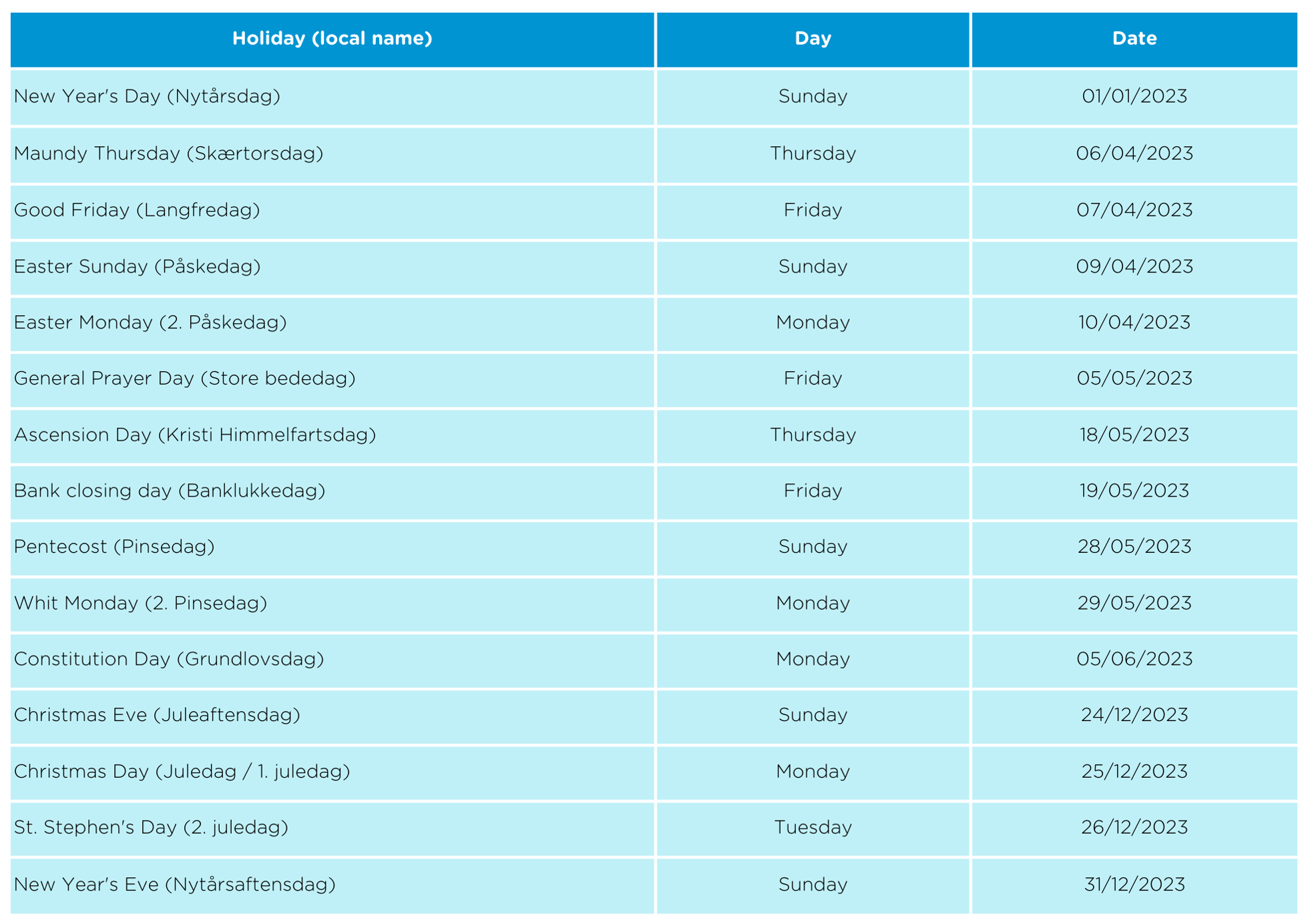 Table 5: Public holidays in Denmark