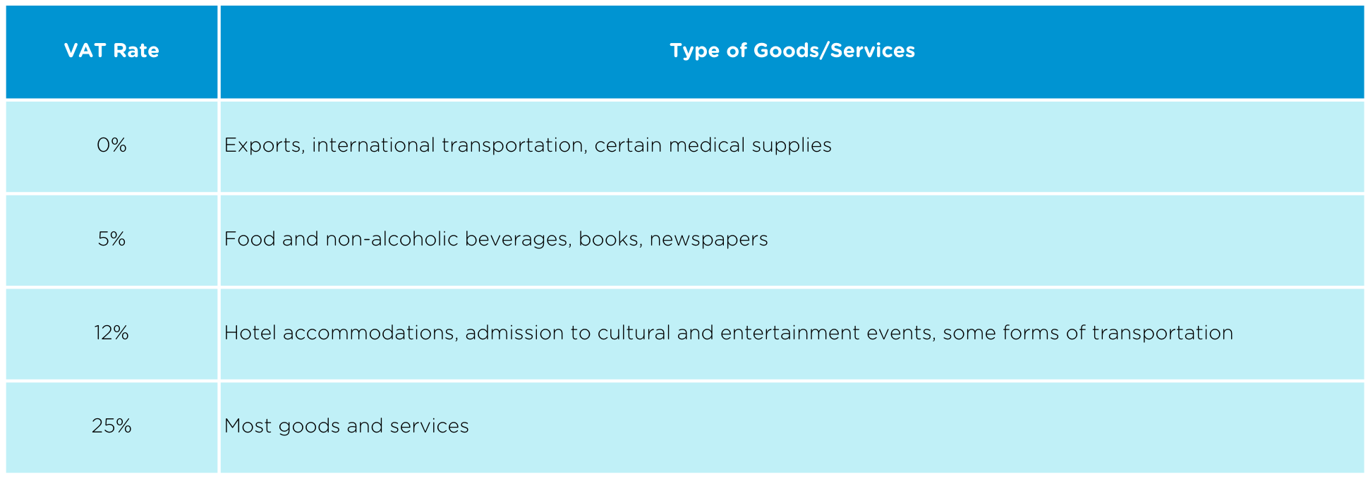 Value-added tax (VAT) is an important source of revenue for the Danish government, contributing to funding public services and infrastructure. The VAT system in Denmark is fairly complex, with different rates and exemptions for various goods and services as follows: