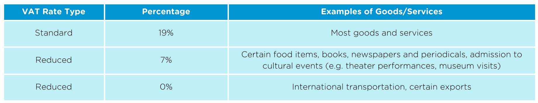 Certain food items, books, newspapers and periodicals, admission to cultural events (e.g. theatre performances, museum visits) |