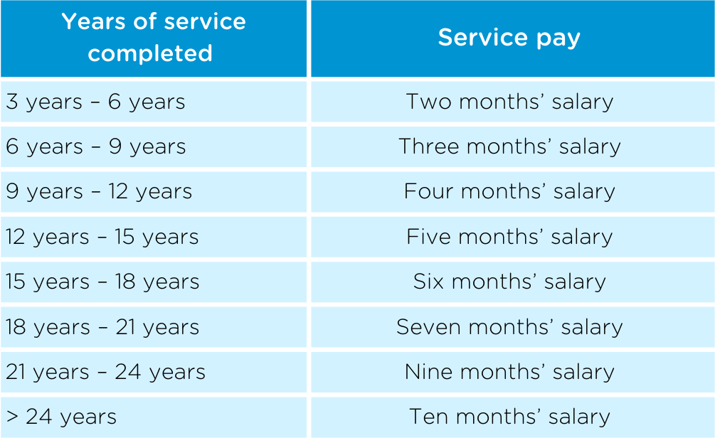 *Not all employees are entitled to termination compensations - only permanent staff are eligible. Contract staff have a contract completion allowance at the end of the contract. If 12 months have been completed upon the end of the contract, they will be eligible for one month's salary. If the agreement is less than 12 months, the payment will be prorated.