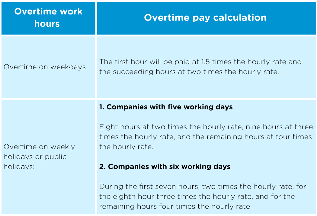 Companies with five working days: Eight hours at two times the hourly rate, nine hours at three times the hourly rate, and the remaining hours at four times the hourly rate