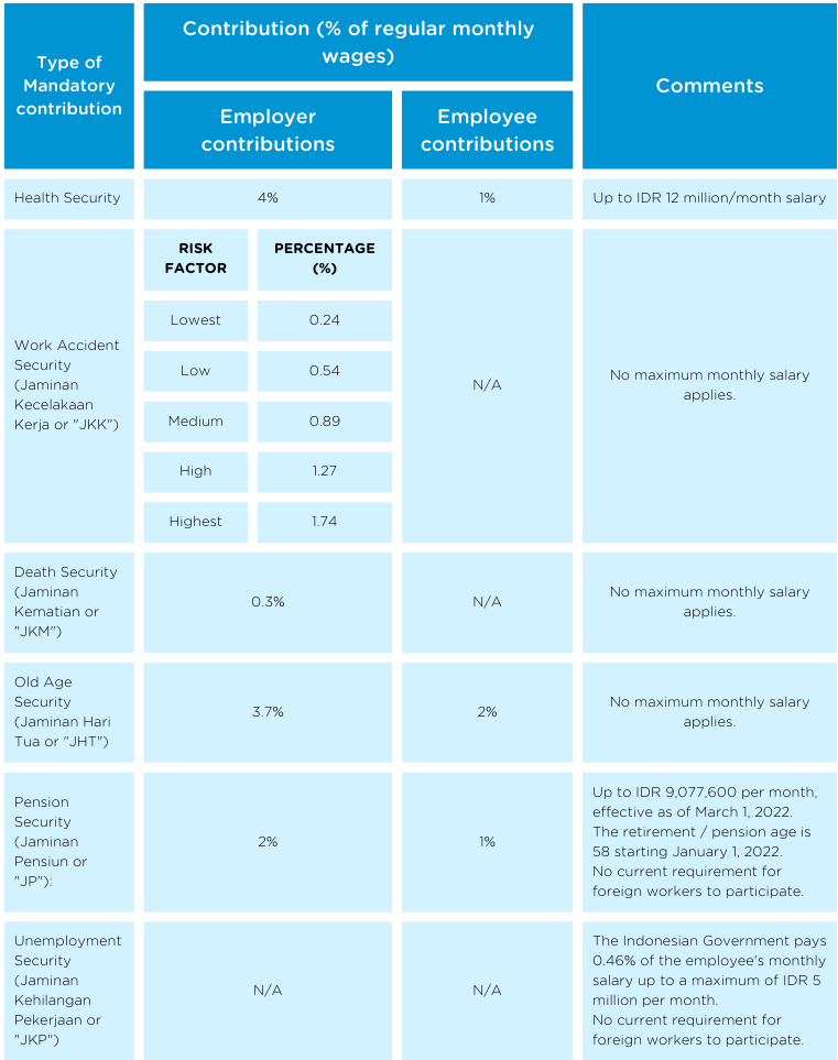 The Indonesian Government pays 0.46% of the employee’s monthly salary up to a maximum of IDR 5 million per month.