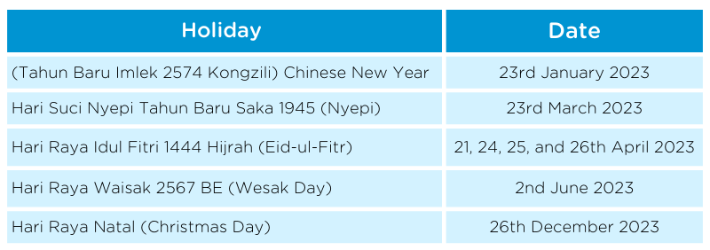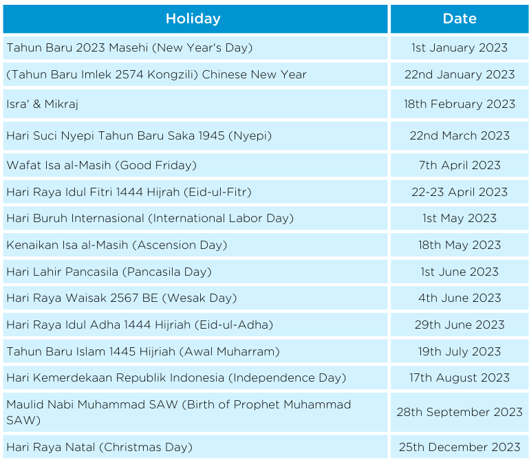 Employees are also eligible for a yearly religious holiday bonus called Tunjangan Hari Raya (THR), paid out one business week before the religious festivities: