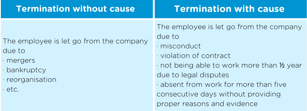 In Indonesia, an employee must be given a 30-day notice to terminate the employment contract. Termination can be initiated by the employer via dismissal or by the employee via resignation. There are two types of termination: