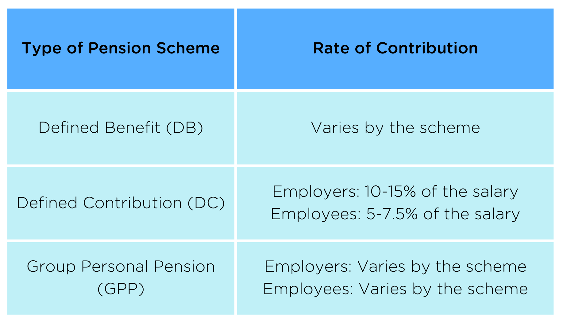 Note: The contribution rate for Defined Benefit (DB) schemes can vary depending on the specific scheme and may be based on factors such as length of service, salary, and age. The rates listed for Defined Contribution (DC) and Group Personal Pension (GPP) schemes are general guidelines and can vary depending on the scheme and the employer's and employee's contributions.