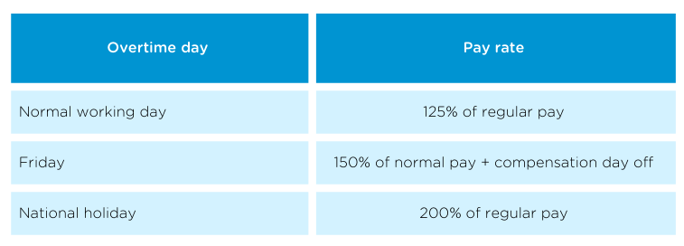 After working five consecutive hours, employees are entitled to a one-hour break, which isn’t counted as part of the workday.