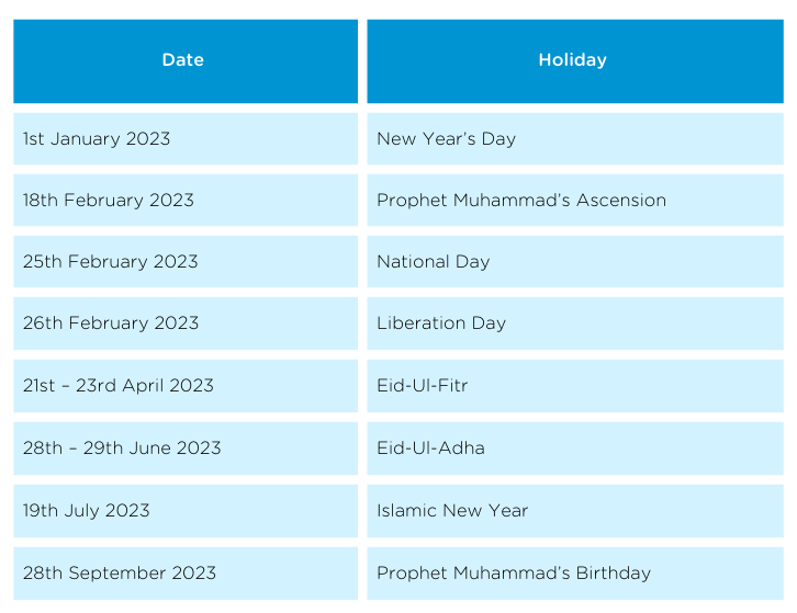 In Kuwait, eight public holidays are provided, with a total of 11 days off.