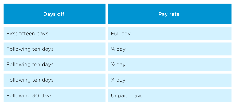 Those in service for at least a month are qualified to receive paid sick leave, provided a medical report from a qualified medical caregiver is furnished. The table below shows the rate employees are paid when they take sick leave: