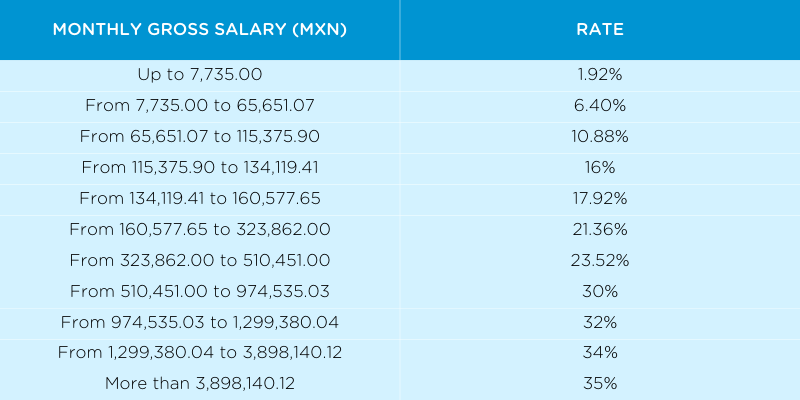 - 26.54% to 33.58% to Social Security (IMSS) - Annual contribution is up to 166,174 MXN