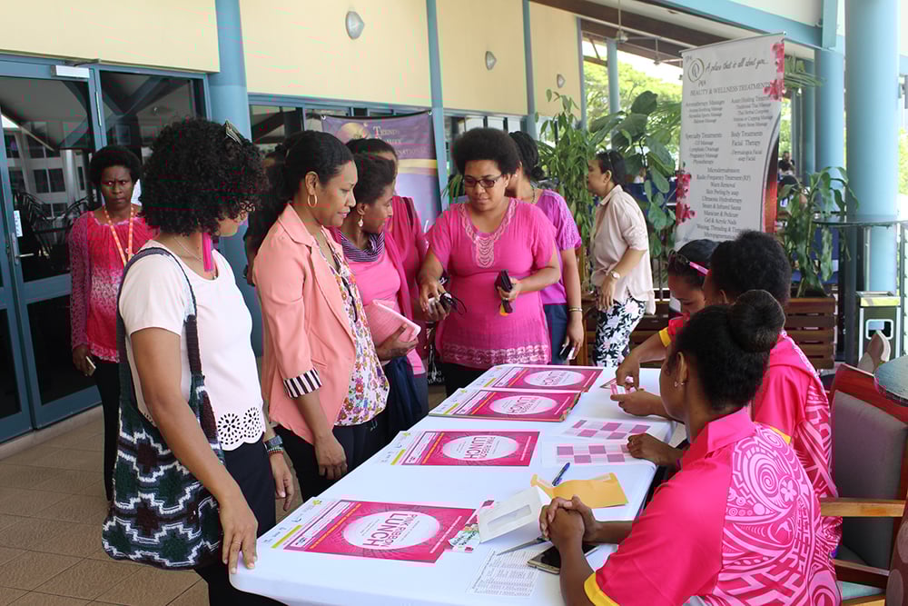 Women signing in at the 2018 Pink Ribbon Lunch hosted by Airswift and the PNG Cancer Foundation (PNGCF)
