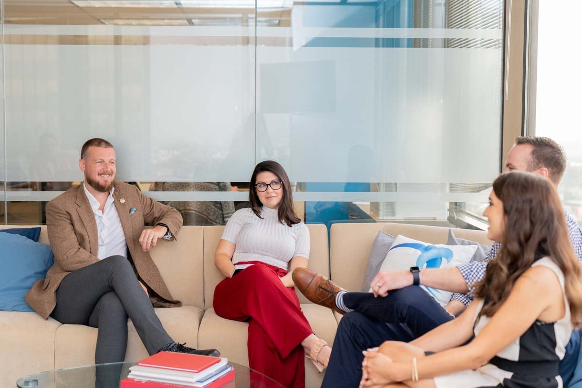 Four women chatting in a modern office: one with a coffee cup, another in floral, one with glasses and a portfolio, and one in a striped blouse.